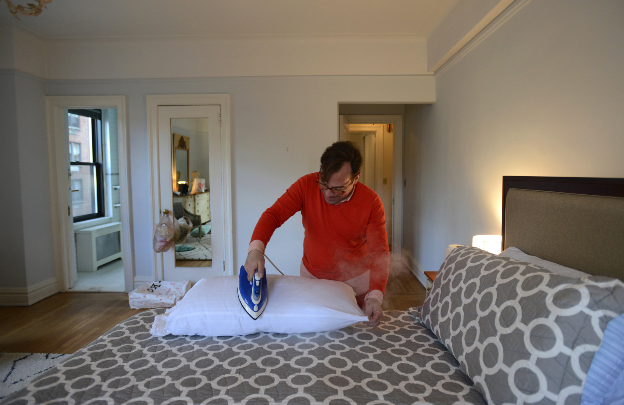 David C. Salvatore, of Edge Mid-Century Designs, irons a pillowcase while staging an apartment.